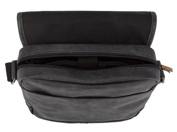 Hauptfach mit Reißverschluss unterhalb des Überschlags, 1 Reißverschlussfach auf dem Überschlag, 1 Vorfach mit Klettverschluss unterhalb des Überschlags, 2 offene Seitensteckfächer, 1 Reißverschlussrückfach, 1 Reißverschlussfach innen, 1 Smartphonefach innen / 1 Steckfach innen, 1 gepolstertes 10" Tablet -Fach innen, Trolley Befestigunsschlaufe, stufenlos verstellbarer Schulterriemen. Maße in cm: 32x9x30