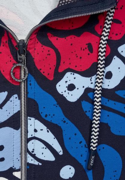 Sporty Look! Die Damen Shirtjacke von CECIL sorgt mit ihrem farbenfrohen Allover Print für gute Laune. Sportliche Akzente setzen die Kapuze mit Tunnelzugband und elastische Ärmelbündchen. Der durchgehende Frontreißverschluss lässt sich hoch schließen und praktische Eingriffstaschen auf der Vorderseite machen die Shirtjacke zum perfekten Alltagsbegleiter.